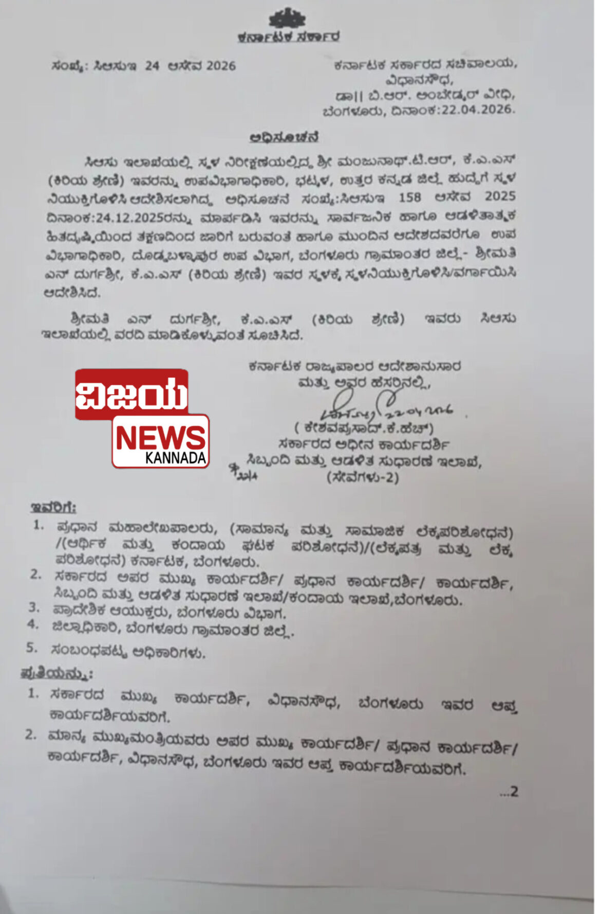 ನೂತನ ಉಪ ವಿಭಾಗಾಧಿಕಾರಿಯಾಗಿ ಮಂಜುನಾಥ್ ಅವರನ್ನು ನೇಮಕ ಮಾಡಲಾಗಿದೆ.ವರ್ಗಾವಣೆ ಯಾಗಿರುವ ದುರ್ಗಶ್ರಿ ಅವರಿಗೆ ಯಾವುದೇ ಹುದ್ದೆ ತೋರಿಸಿಲ್ಲ.